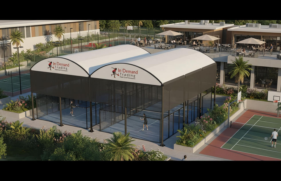Whether you want a sleek canopy or a fully enclosed rain-and-sun-proof structure, In Demand Trading offers custom dynamic designs tailored to your court layout and branding.